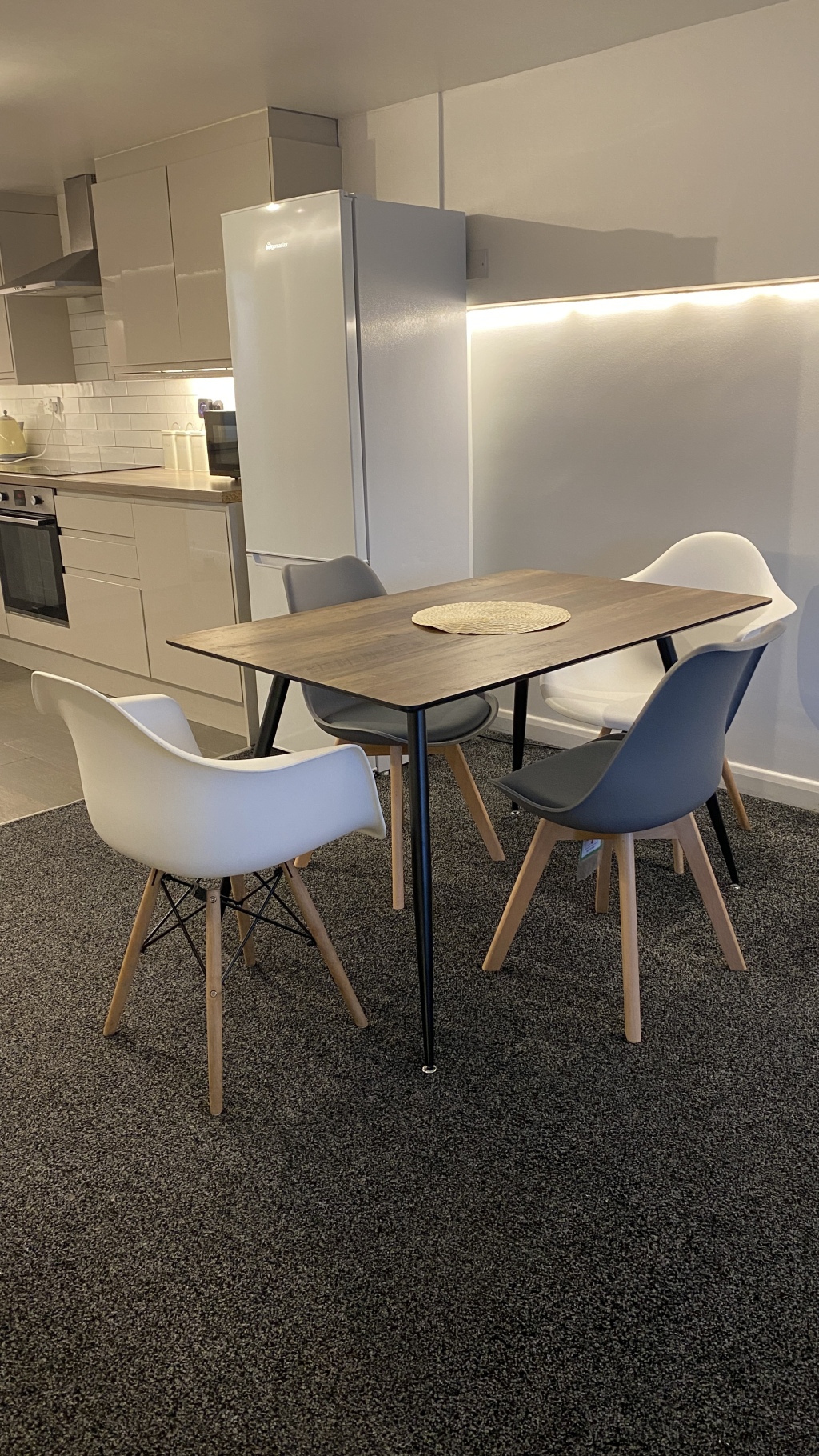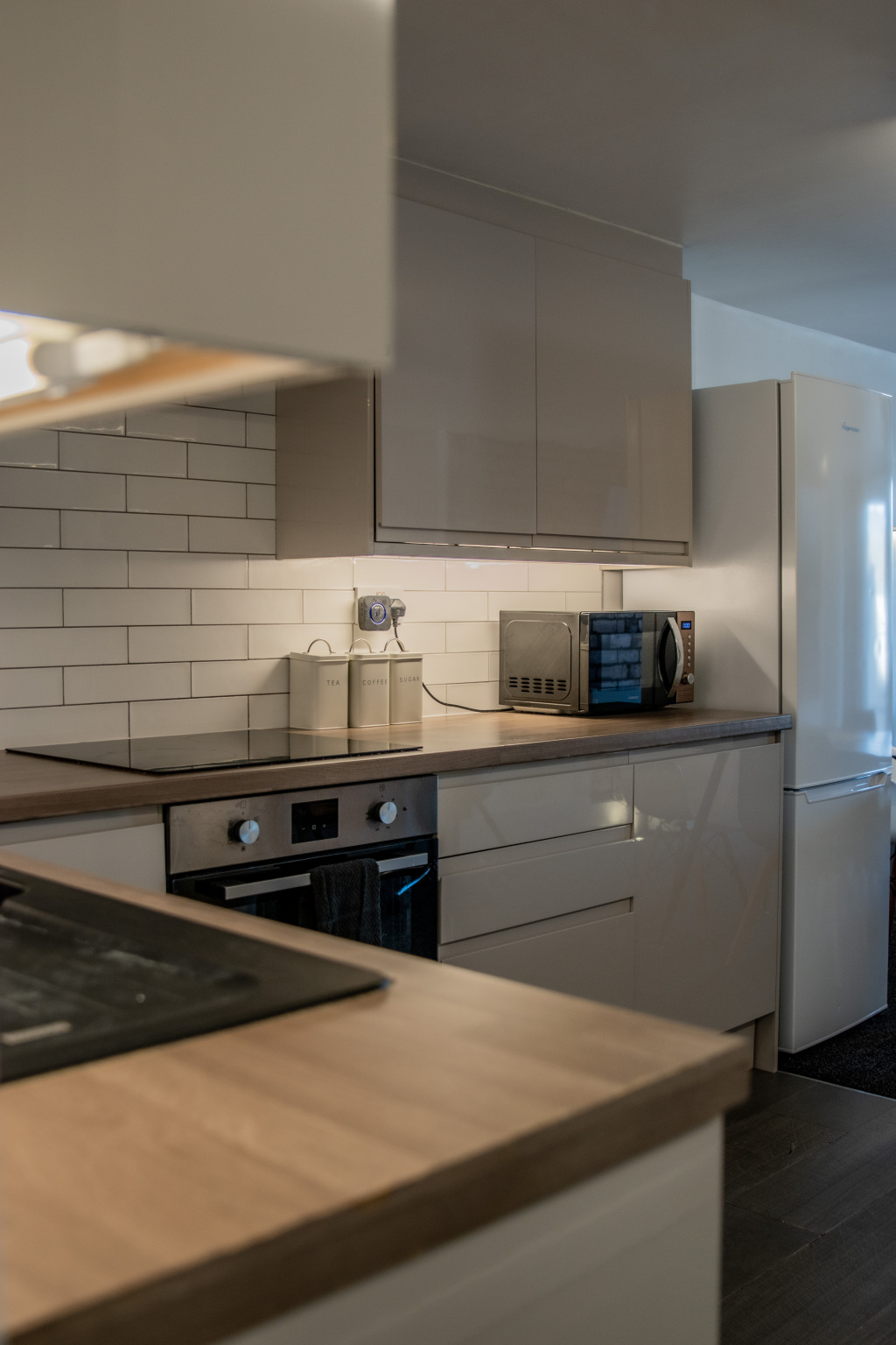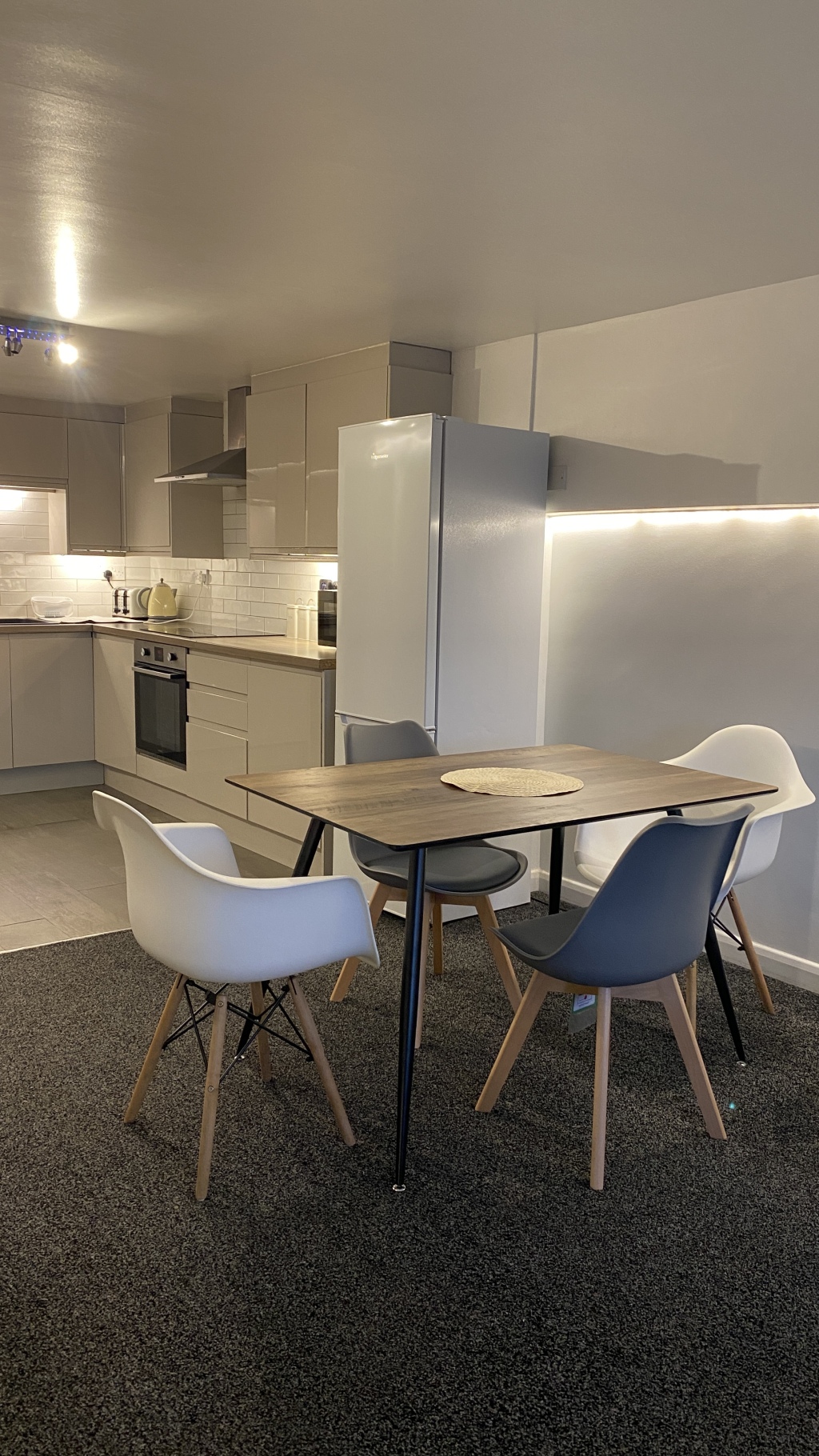 The spacious Bedroom has a king size bed provided with custom made luxury headboard, wardrobe, mirror and bedside cabinets. There is a study table , swivel chair and light. The bedroom is very spacious. There is the spacious Living/Dining and kitchen. The specification kitchen comprises of integrated fridge, freezer, oven, microwave, kettle, toaster washing machine, dishwasher and a four-ring touch sensitive induction Hob. The kitchen is fully equipped for all your cooking needs with appliances, and utensils.