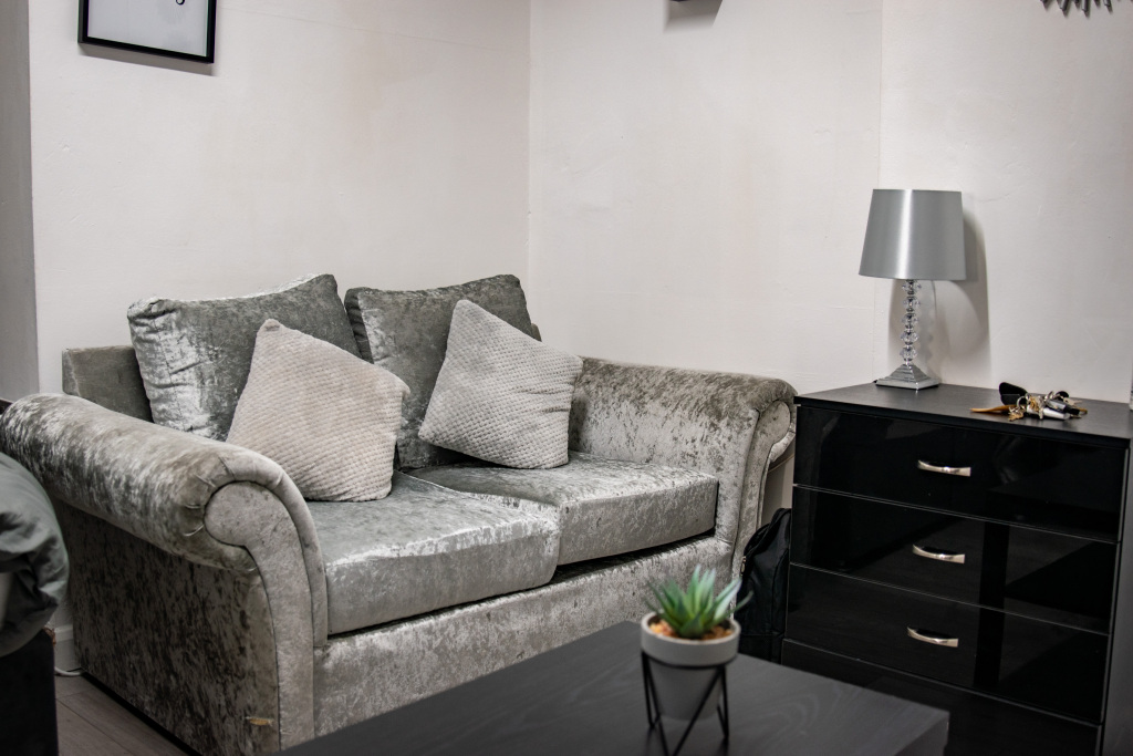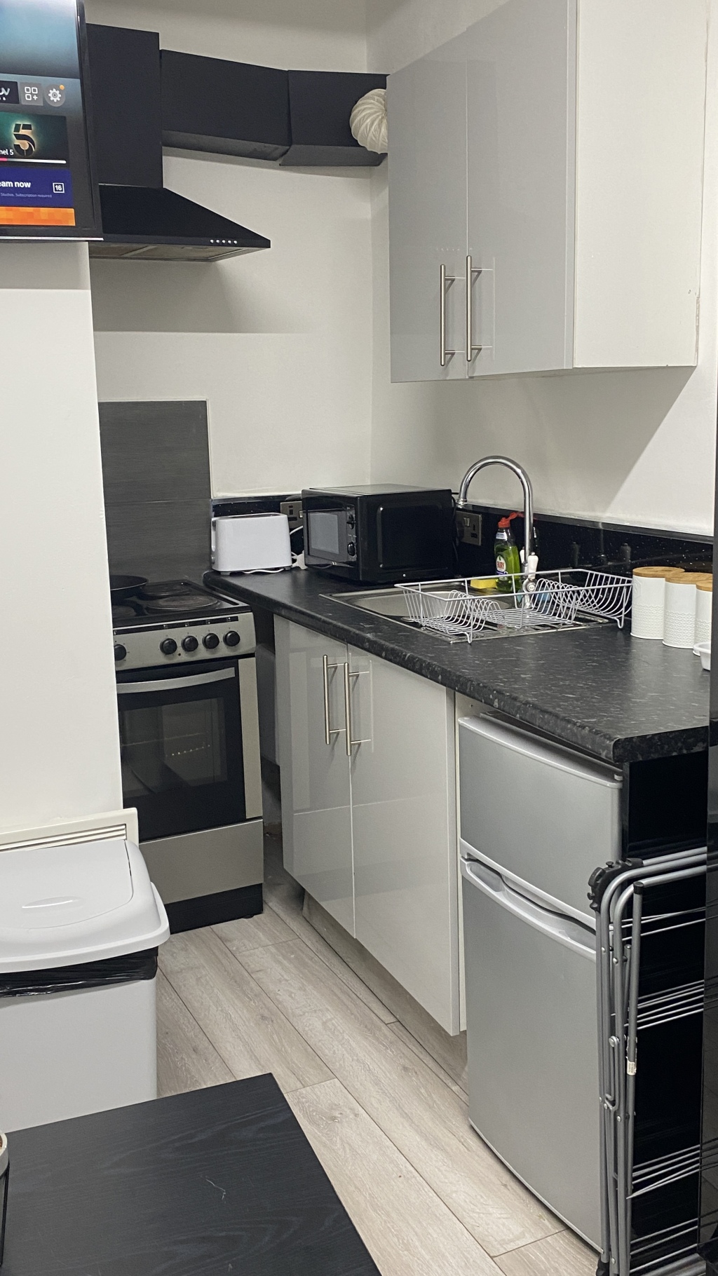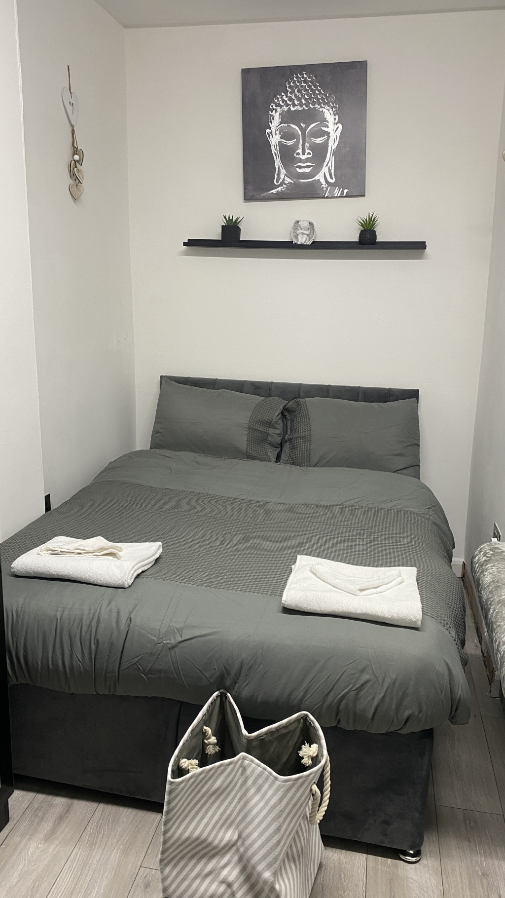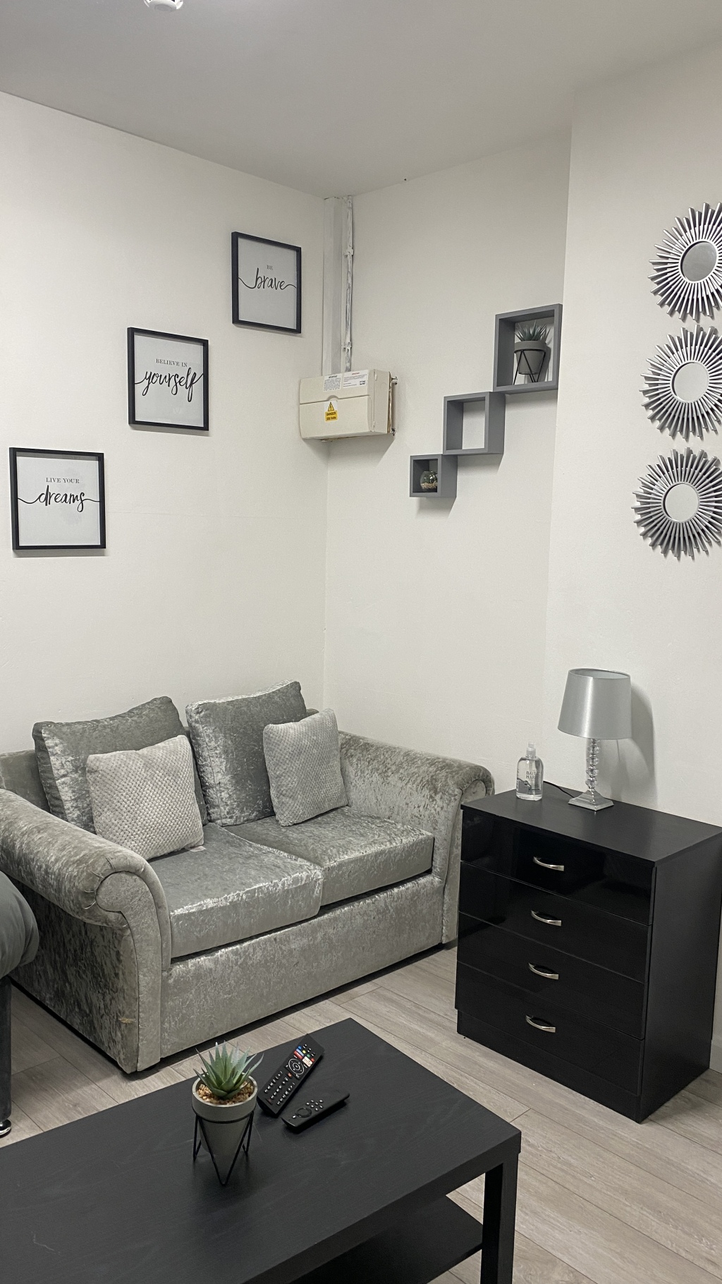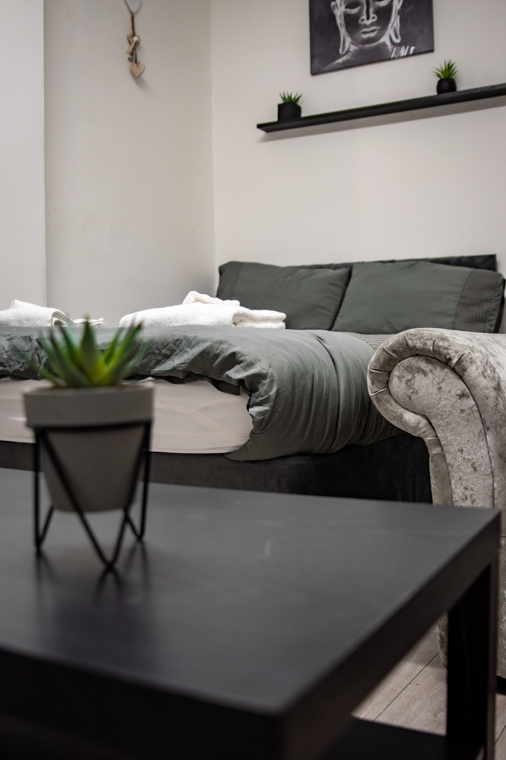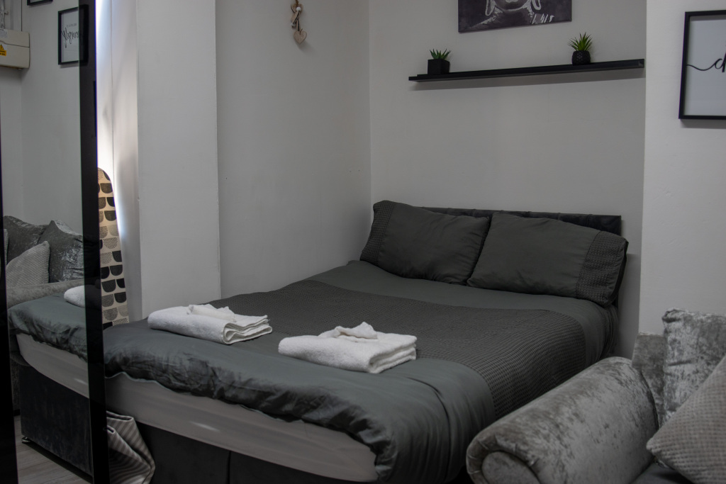 This stylish 1-bed/1-bath studio apartment is clean, conveniently located in town centre, and able to sleep 2 guests comfortable. There is a double bed and mattress, along with a sofa. The kitchen is fully equipped for all your cooking needs with appliances and utensils. The bathroom includes and dispenser with soap, shampoo, and conditioner. Complimentary amenities include wi-fi, heating, and a 40” Smart TV with amazon stick loaded with plenty of movie apps. Free coffee, and tea, are included.