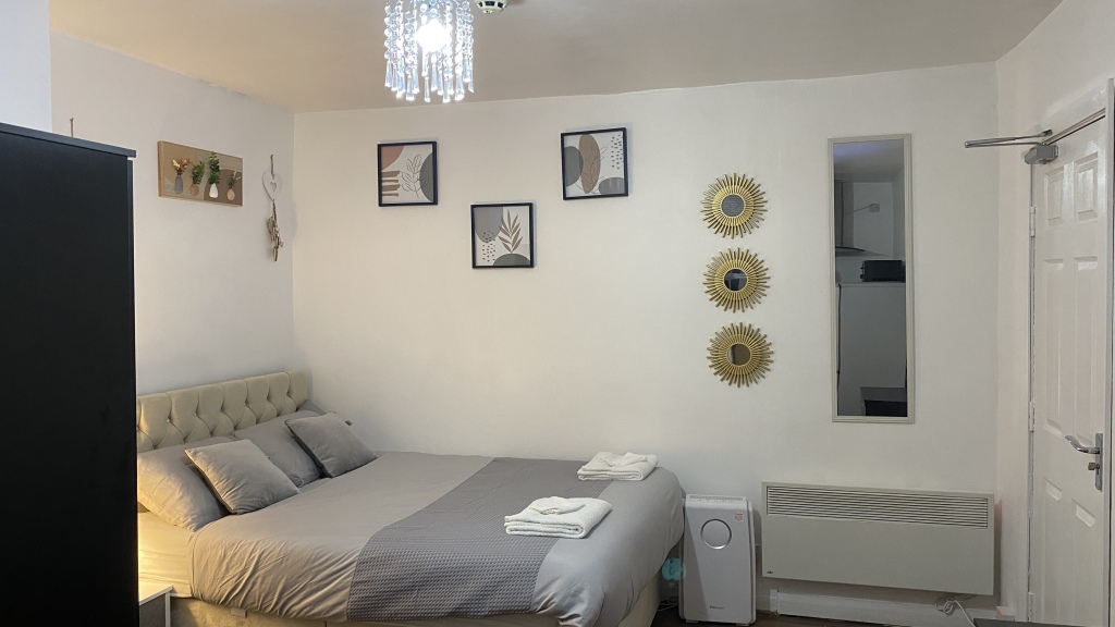 This stylish 1-bed/1-bath studio apartment is clean, conveniently located in town centre, and able to sleep 2 guests comfortable. There is a double bed and mattress, along with a sofa. The kitchen is fully equipped for all your cooking needs with appliances and utensils. The bathroom includes and dispenser with soap, shampoo, and conditioner. Complimentary amenities include wi-fi, heating, and a 40” Smart TV with amazon stick loaded with plenty of movie apps. Free coffee, and tea, are included.