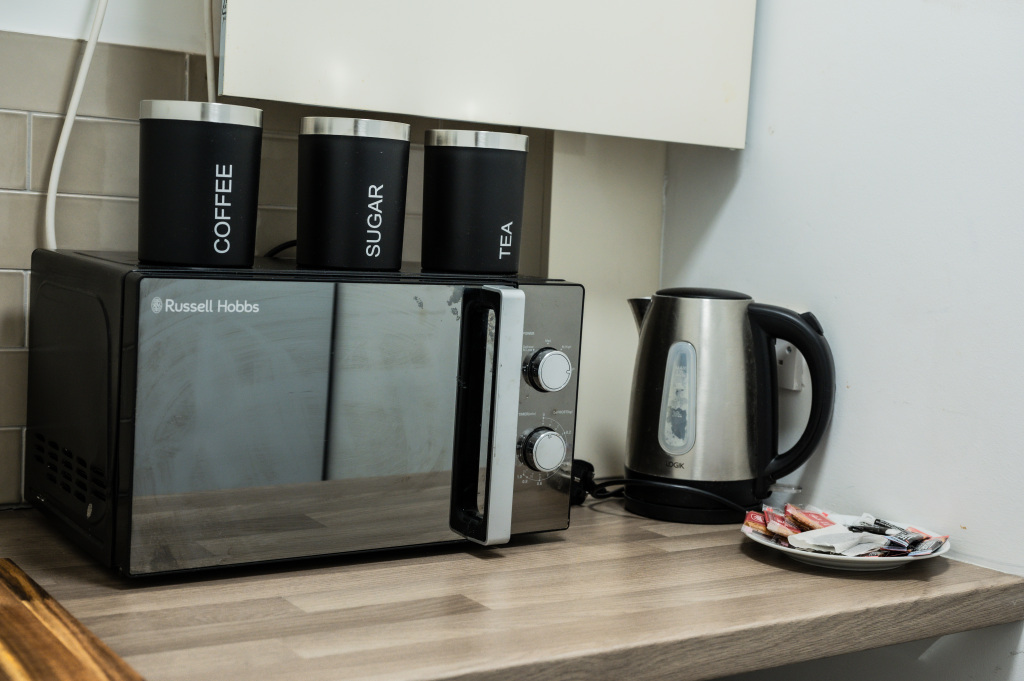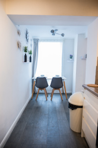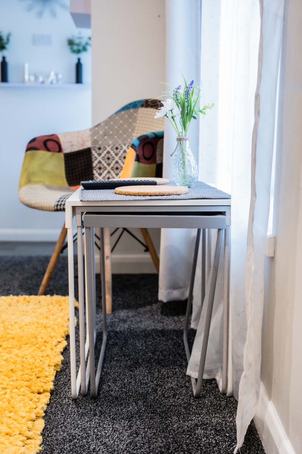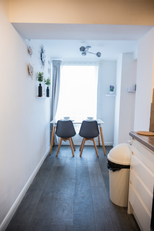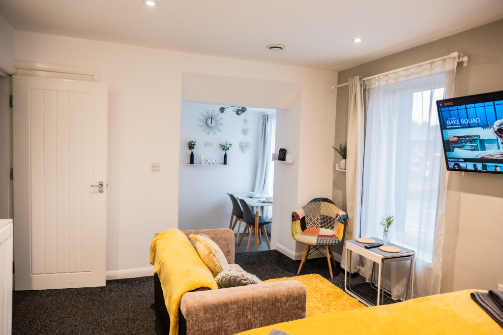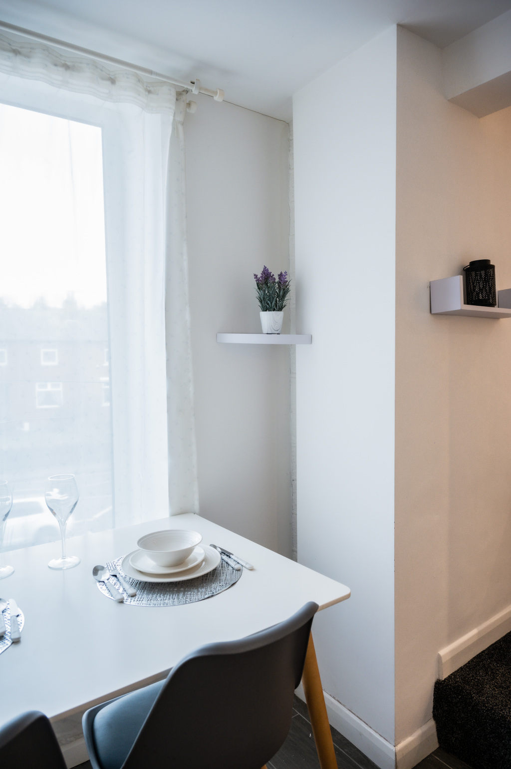 This 1-bed/1-shower apartment is located approximately 10 mins away from Huddersfield town centre by car or local transport. There is a retail park minutes away from the building which is home to many shops and fast food outlets. The open-concept kitchen, dining room, and living room are spacious for 2 guests.