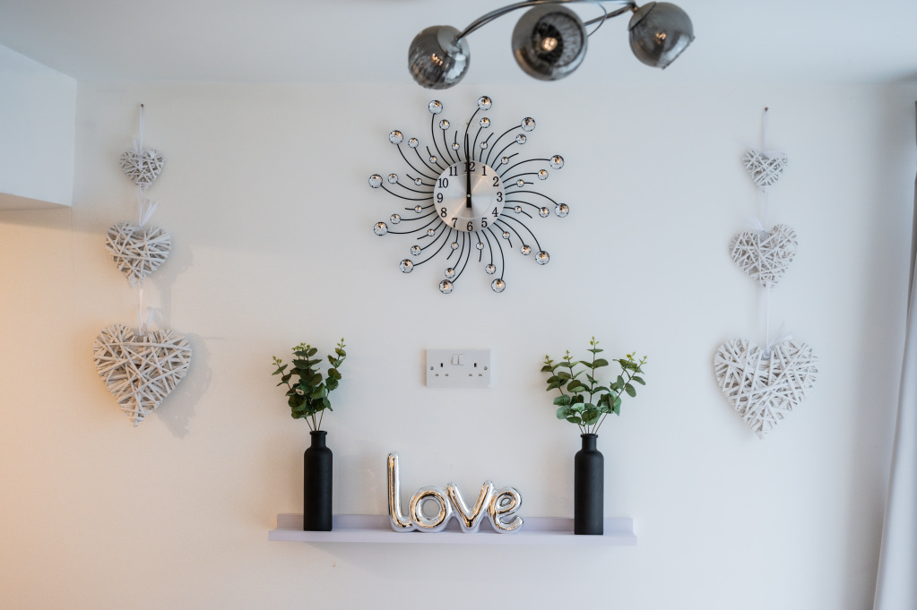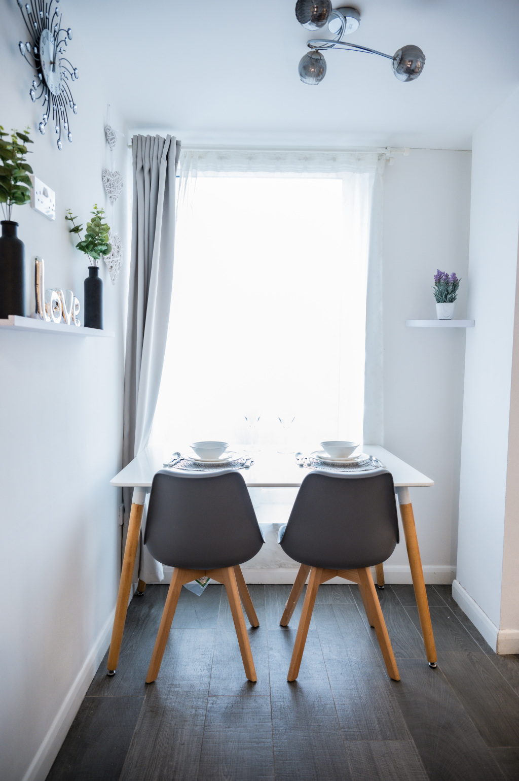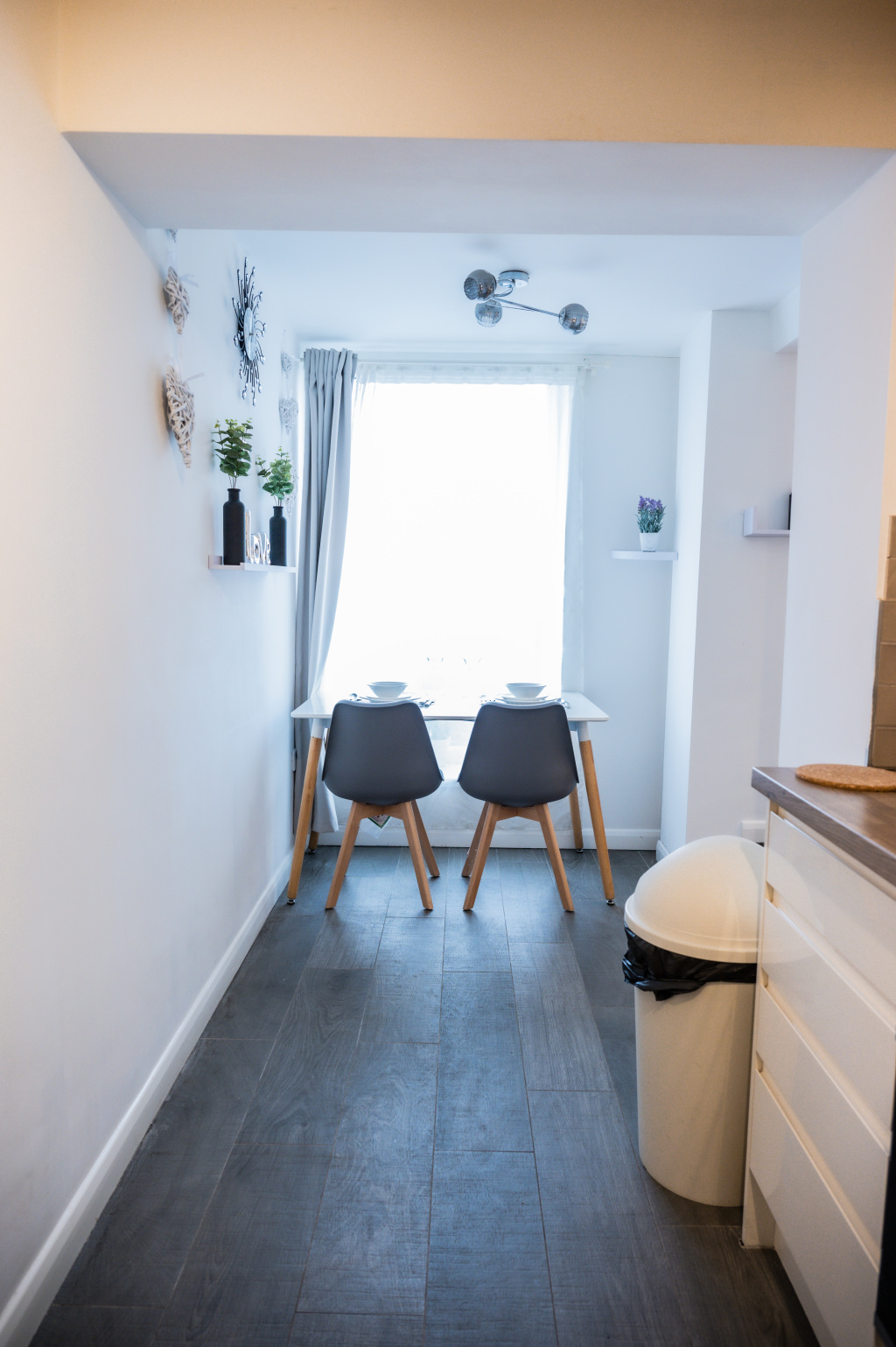 The spacious Bedroom has a king size bed provided with custom made luxury headboard, wardrobe, mirror and bedside cabinets. The bedrooms are very spacious. There is the spacious Living/Dining and kitchen. The specification kitchen comprises of integrated fridge, freezer, oven, microwave, kettle, toaster washing machine, dishwasher and a four-ring touch sensitive induction Hob. The kitchen is fully equipped for all your cooking needs with appliances, and utensils.