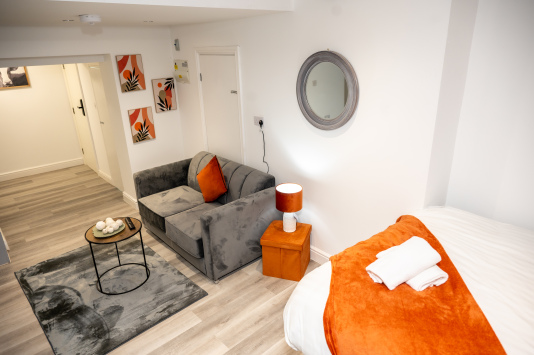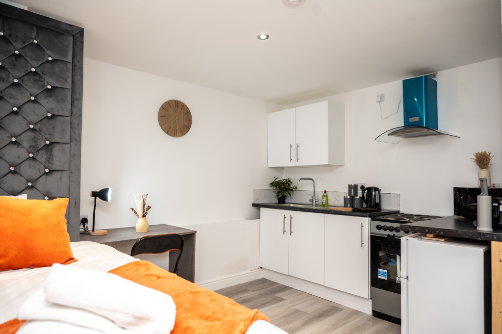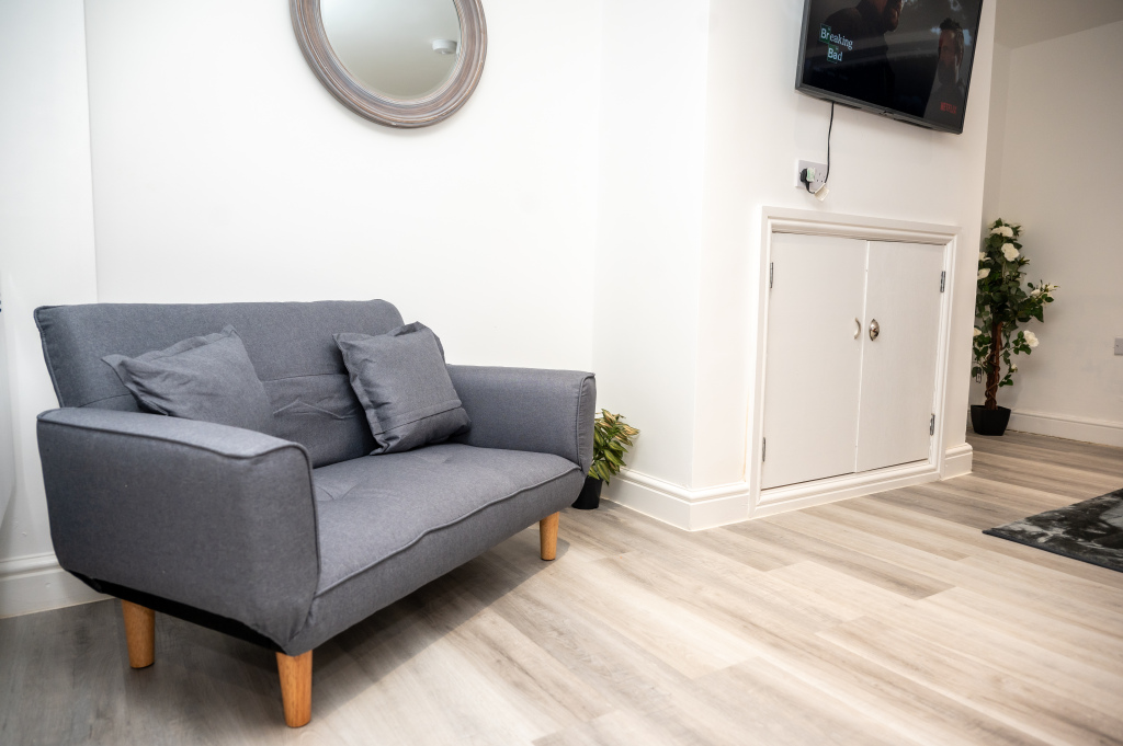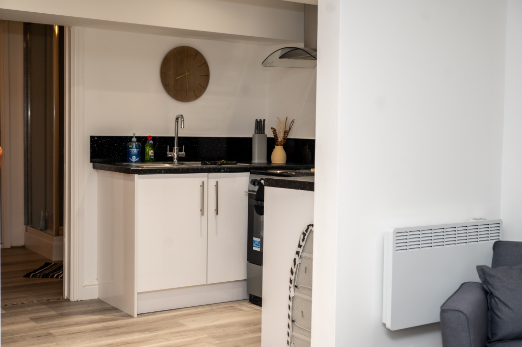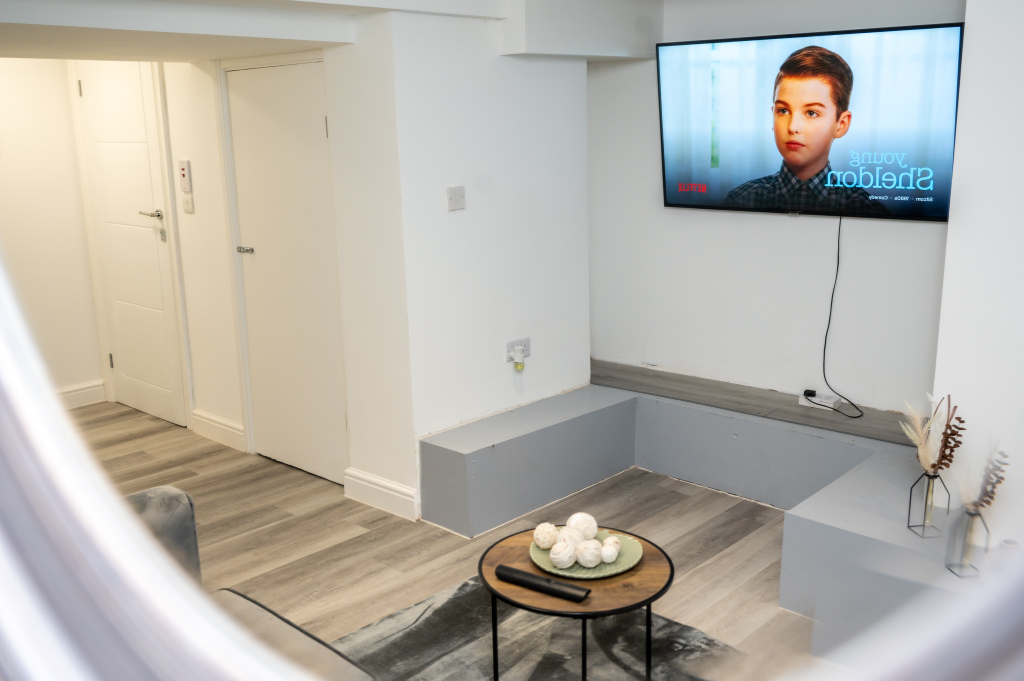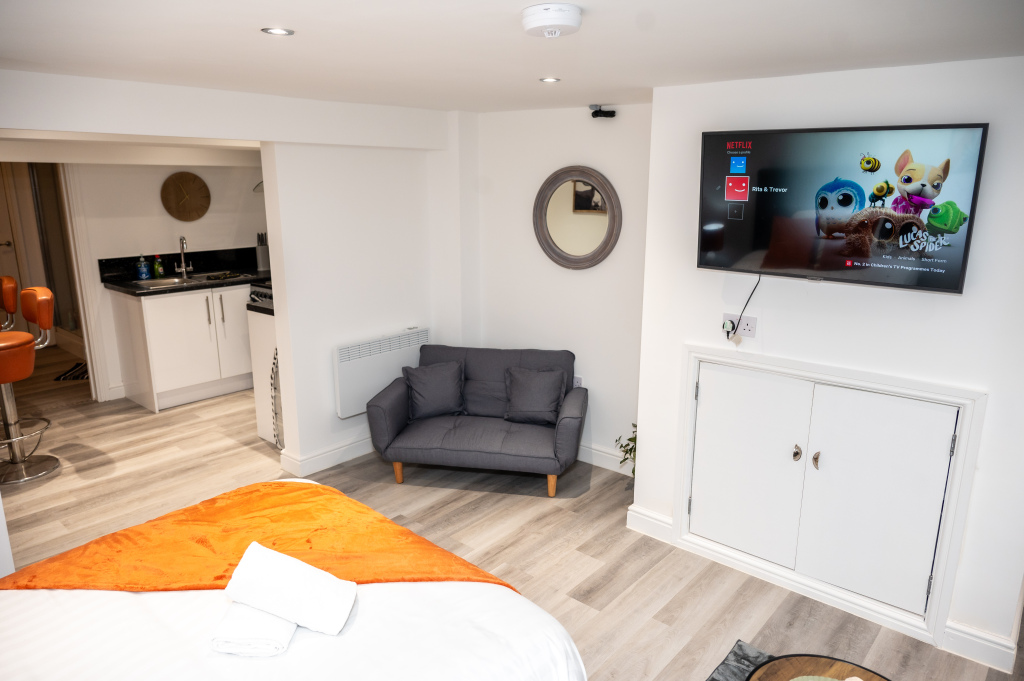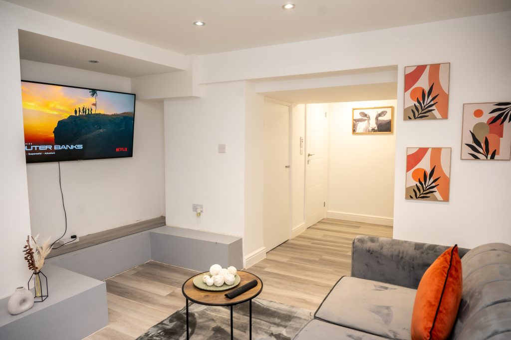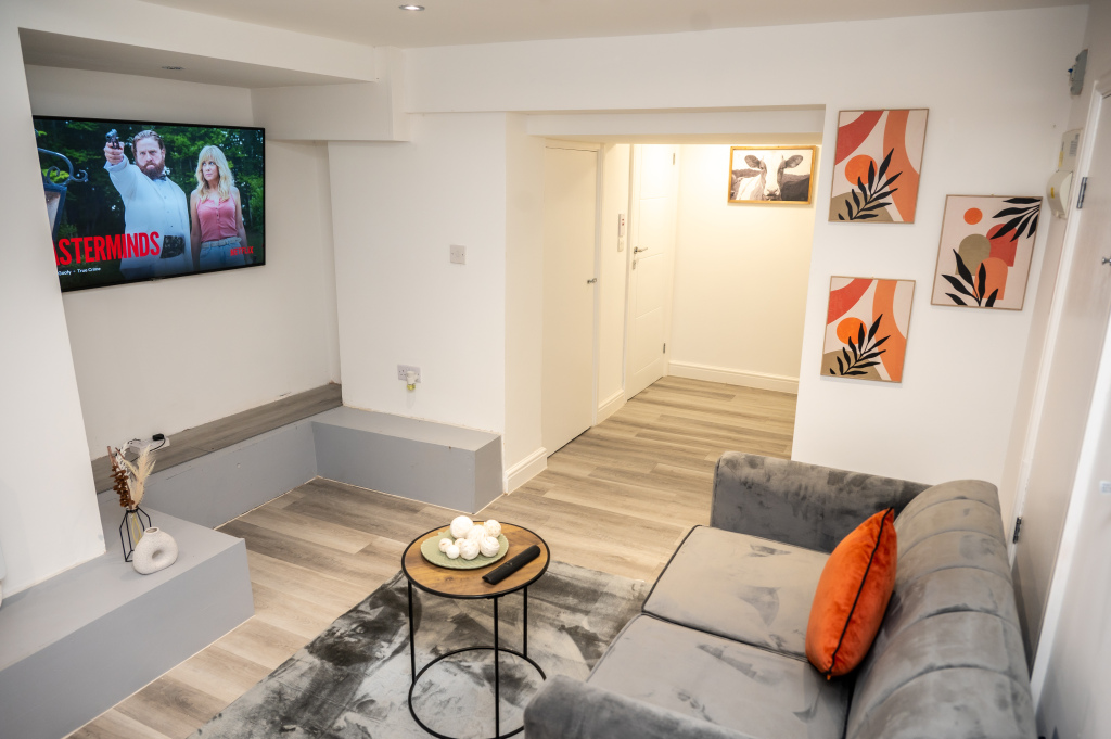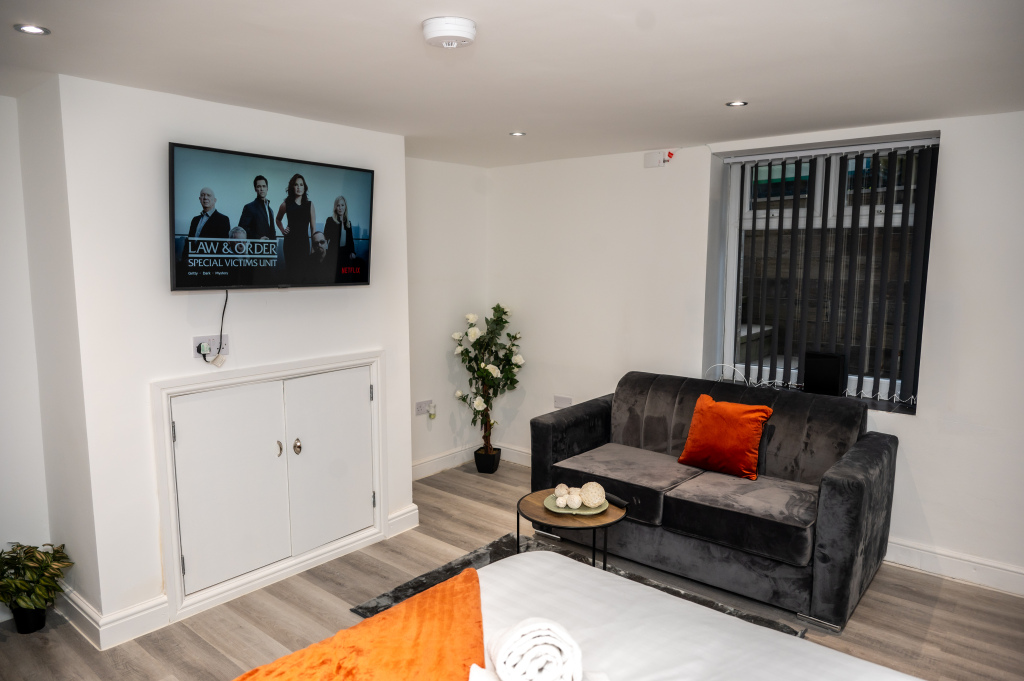 Welcome to our cosy hideaway basement studio, ideally located in the vibrant town centre of Huddersfield, just across the road from Huddersfield University. This charming retreat offers a comfortable living space with a plush sofa and flat-screen TV, perfect for relaxing after a day of exploring or working. The well-equipped…